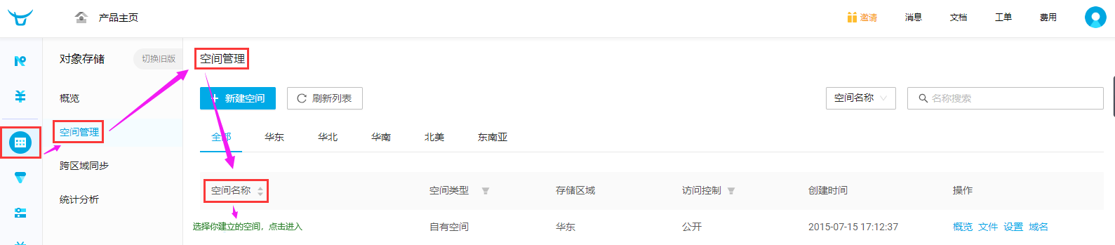存储区域:创建空间时,选择的存储区域,从z0到z1,依次对应:华东、华北、华南、北美、东南亚。